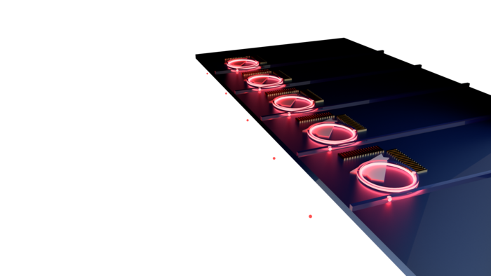 imagen: Una matriz de fuentes de fotones individuales a pedido integradas de manera determinista con fotónica basada en silicio, creada a partir de la integración híbrida de materiales 2D con resonadores de nitruro de silicio.