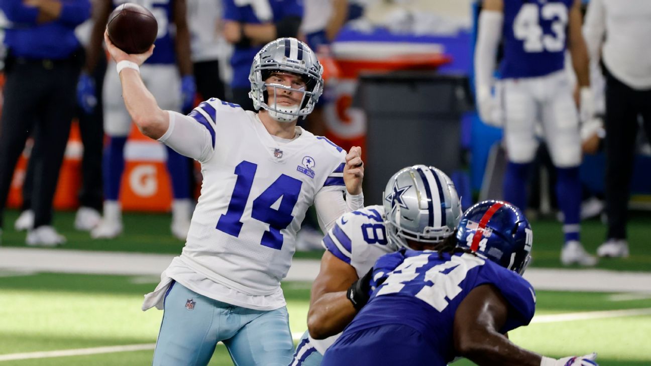 Dalton completó nueve de 11 pases para 111 yardas y lideró la racha ganadora de cinco juegos, 72 yardas en 52 segundos, antes de Greg Zuerlein patear la canasta ganadora para completar el juego.