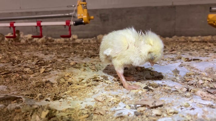 Mientras tanto, los pollos crecen tan masivamente debido a la reproducción que sus huesos y órganos no pueden seguir el ritmo. Los músculos del pecho en particular se vuelven anormalmente grandes. El dolor, la deformidad y la falla orgánica son las consecuencias. Los videos muestran claramente cuán lentamente se mueven los pollos de cuatro semanas, que en realidad todavía son pollitos. Si un humano creciera tan rápido como estos pollos de engorde, alcanzarían un peso de 300 kg en la infancia. En el video, muchos pollos de engorde yacen exhaustos o incluso en agonía en el suelo, que está lleno de excrementos. Algunos estiran y tuercen las piernas, señal de piernas o espaldas deformes. En el medio, siempre hay animales muertos que murieron desapercibidos.