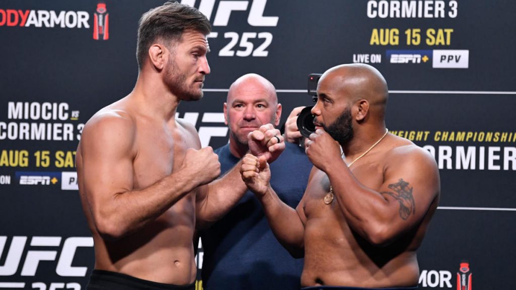 Finalmente ha llegado la noche para que una de las mayores rivalidades de peso pesado de UFC termine cuando el campeón de peso pesado Stipe Miocic y Daniel Cormier se enfrentarán por tercera vez en la evento principal de UFC 252. La pareja ha dividido sus dos encuentros anteriores, con Cormier ganando el título con un nocaut en el primer asalto en UFC 226 solo para que Miocic anotara un nocaut en el cuarto asalto para recuperar el título en UFC 241.