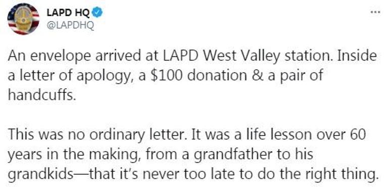 El Departamento de Policía de Los Ángeles dijo: “Esta no era una carta ordinaria. «Fue una lección de vida de 60 años del abuelo a sus nietos, diciendo que nunca es demasiado tarde para cometer un error».
